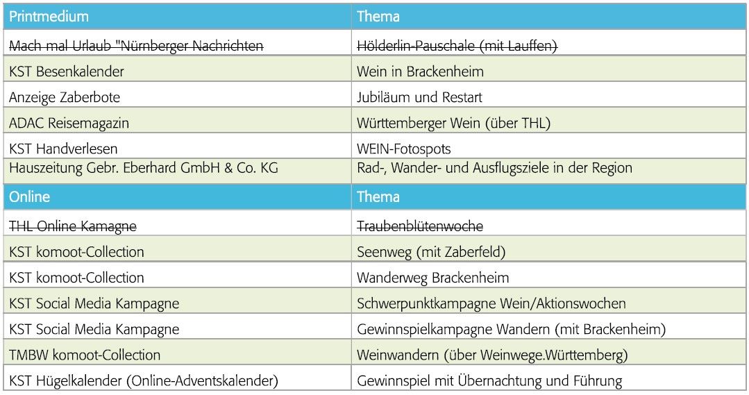 In 16 verschiedenen Druckerzeugnissen, die der Neckar-Zaber-Tourismus inzwischen herausgibt, werden die Angebote der Region beworben. Dies sind zum einen jährliche Prospekte mit ihren vielen termin- und preisbezogenen Informationen, zum anderen Printmedien zu allen touristischen Schwerpunktthemen. Waren bisher Besentermine und Festlesübersicht unverzichtbare Printmedien des Tourismusvereins, wurde im Berichtsjahr aufgrund der unsicheren Lage für Feste, Veranstaltungen und Gastronomie keine Neuauflage gedruckt. Einzig die Pauschalangebote und die Führungstermine wurden als terminbezogene Broschüre herausgegeben.