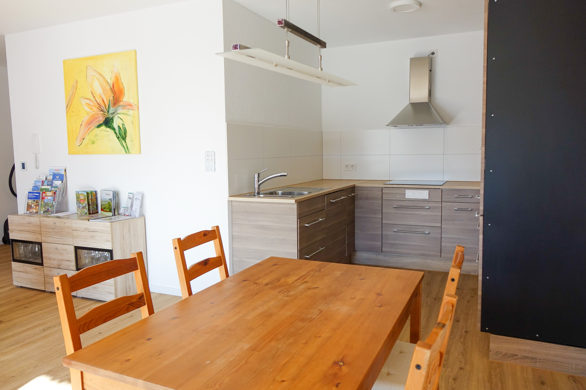 - offene Wohn-Ess-Küche mit Kühl-Gefrierkombi, Spülmaschine, Mikrowelle