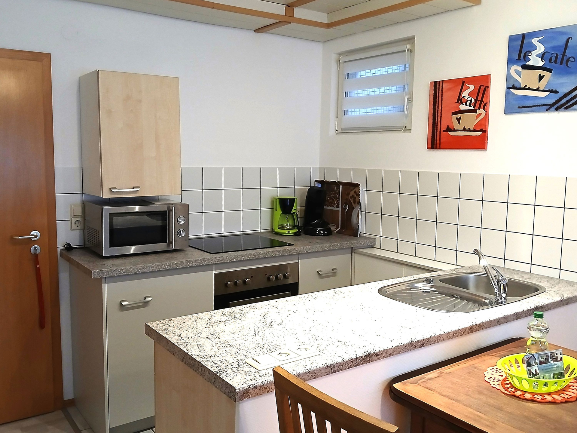 - 1 Wohnraum mit Küchenzeile mit Kühlschrank, Herd, Backofen, Spülmaschine, Toaster, Kaffeemaschine usw.
