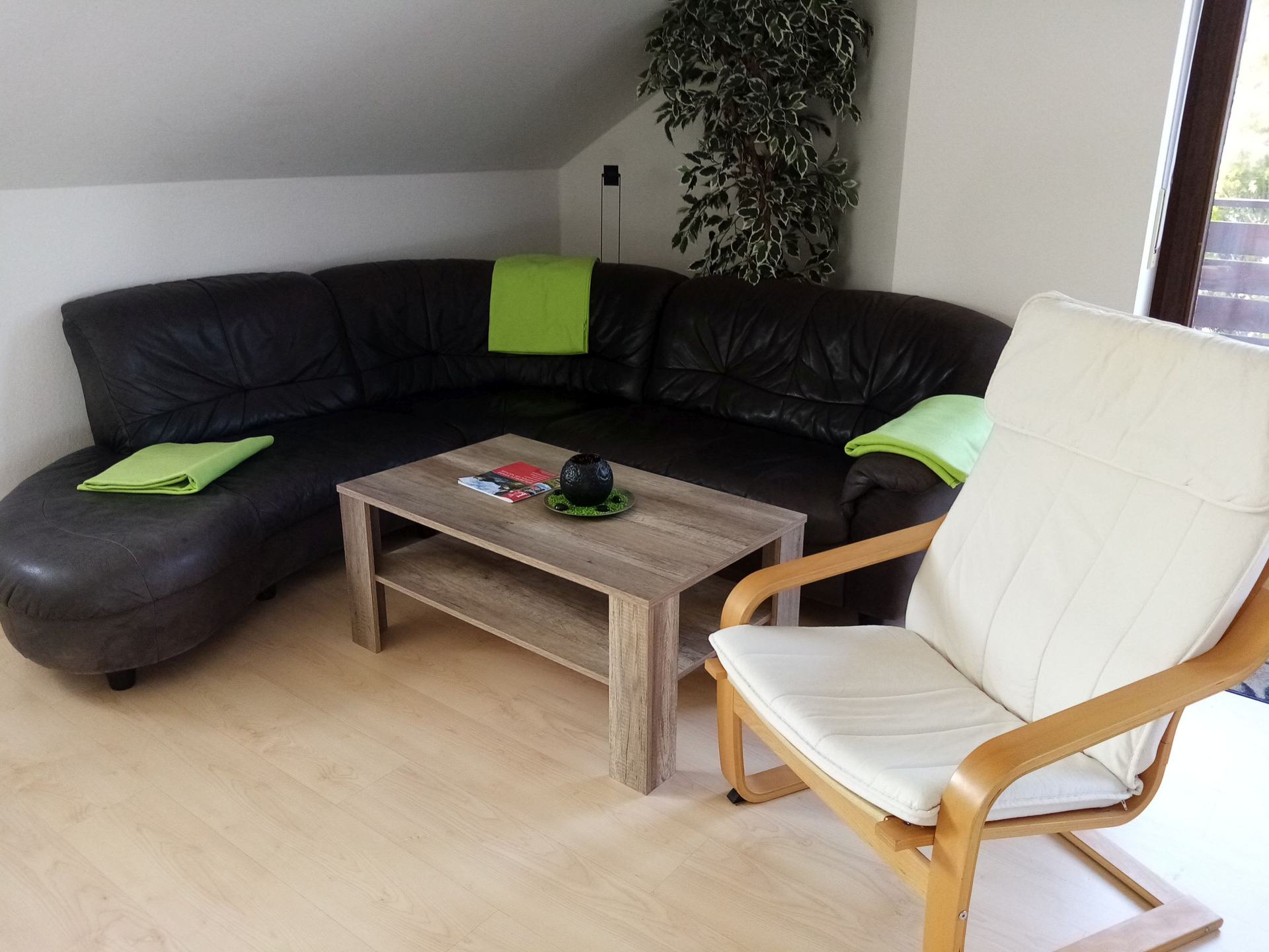 Wohnzimmer mit schwarzer Couch und Couchtisch, dazu ein Sessel
