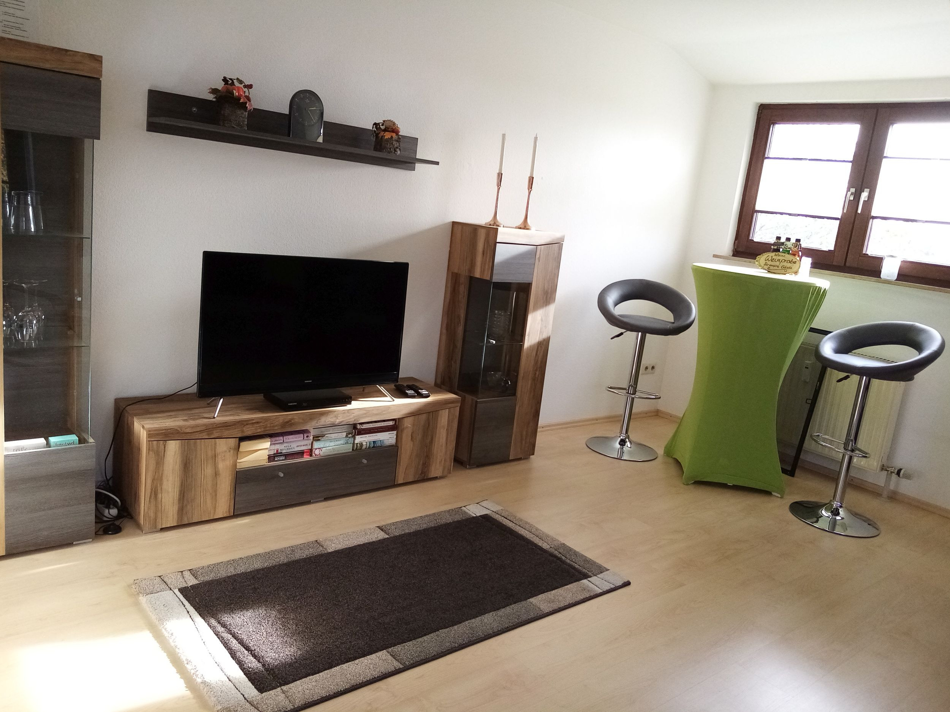 Großes Wohnzimmer mit Fernseher, einem Hochtisch und zwei Barhockern und eine Vitrine