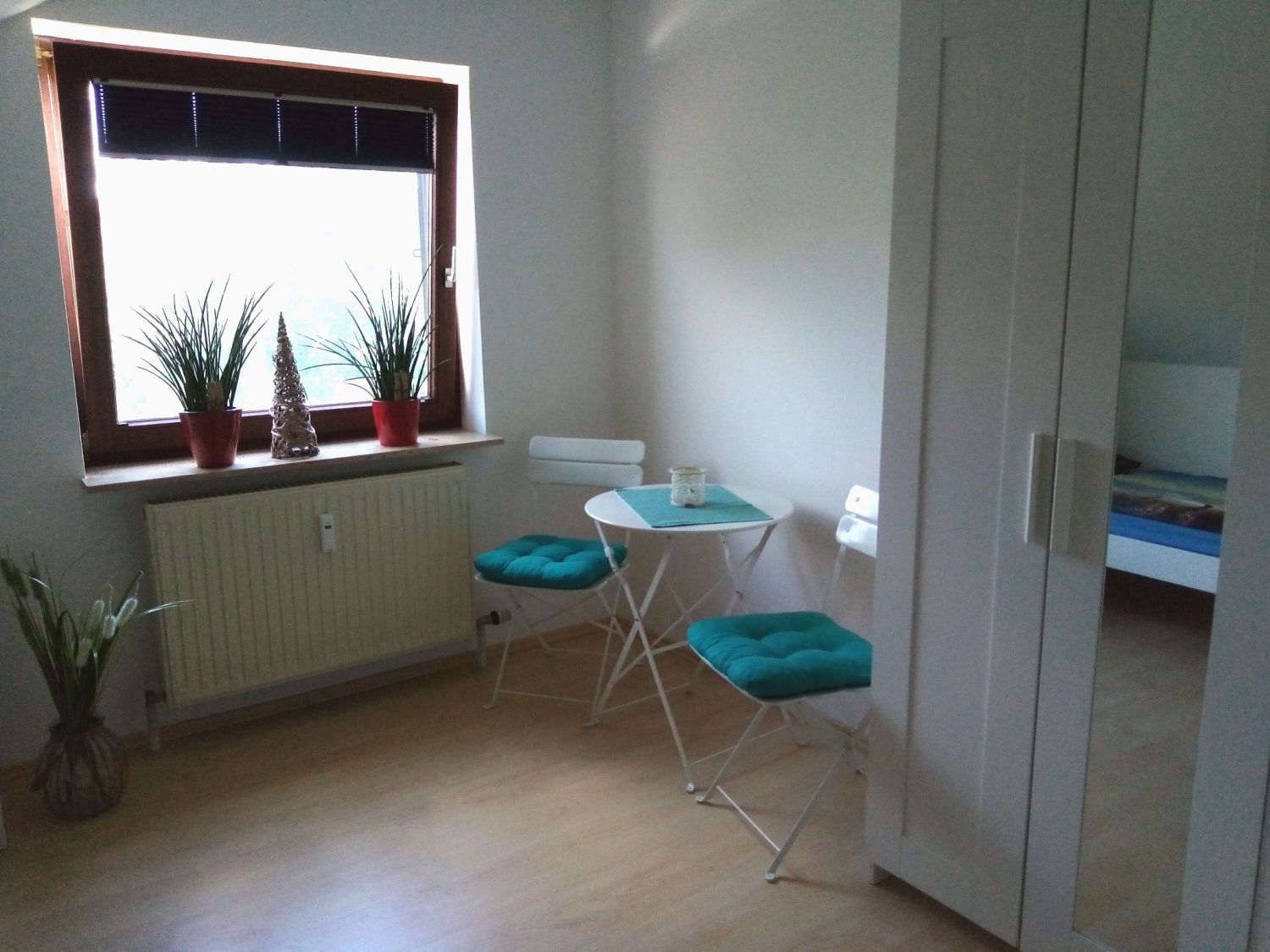 Raum mit kleinem runden Tisch und zwei Stühlen mit türkisenen Sitzkissen