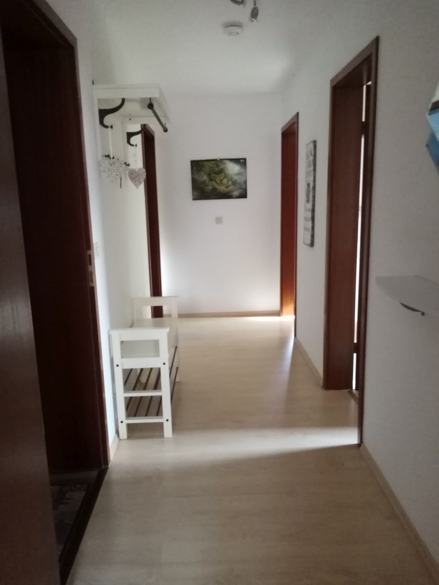 Flur mit vier Türen und einem kleinen niedrigen Schuhschrank