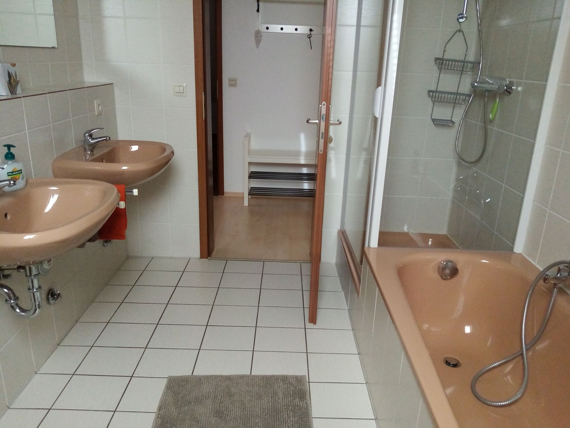 Badezimmer mit Badewanne und zwei Waschbecken und Dusche