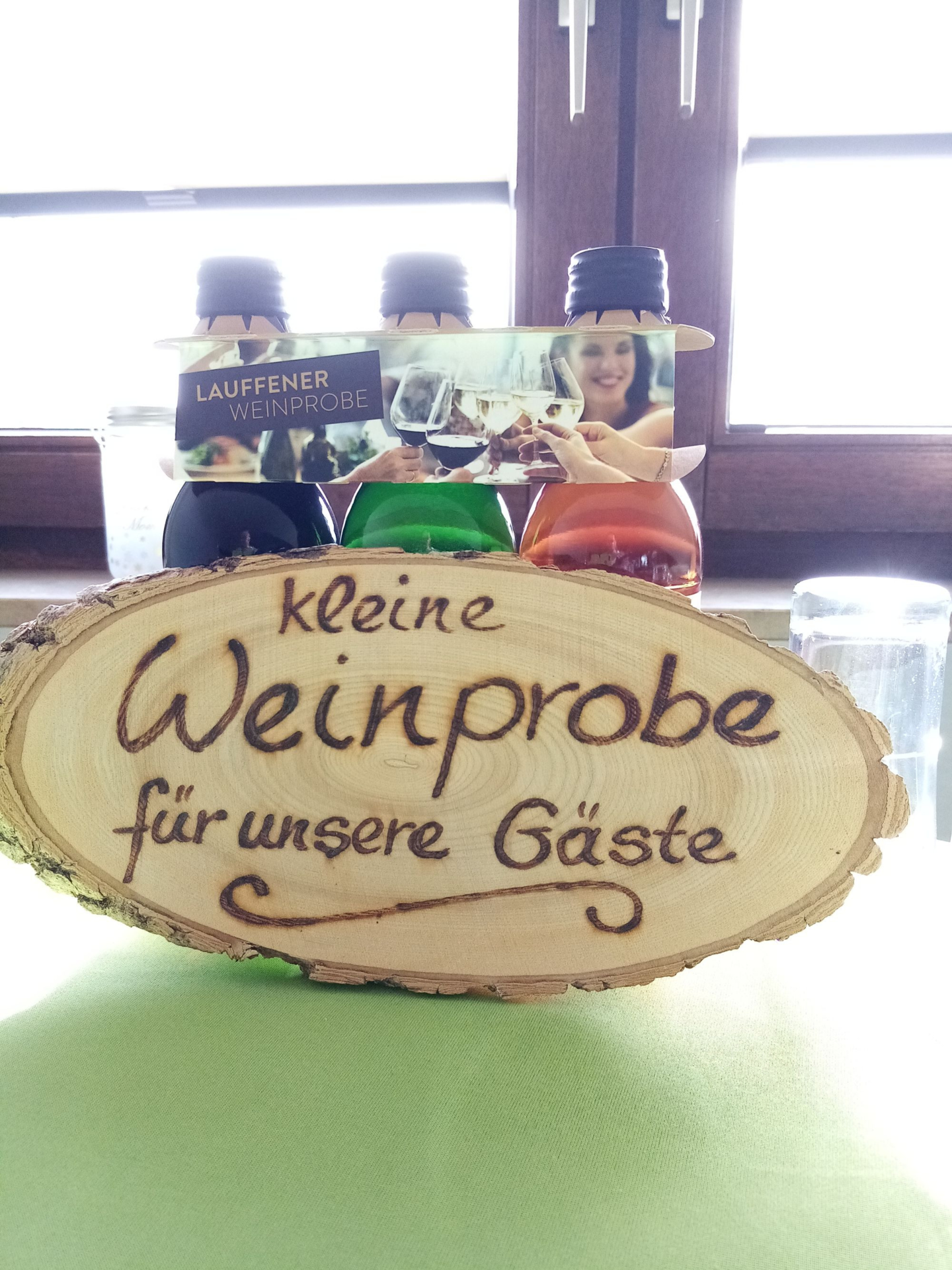 Holzschild: kleine Weinprobe für unsere Gäste