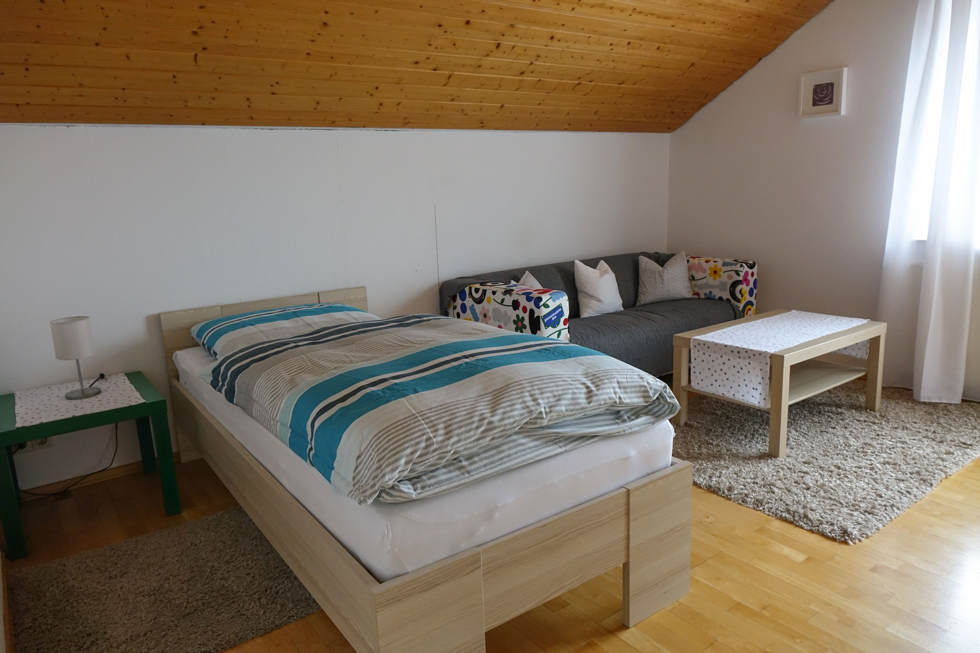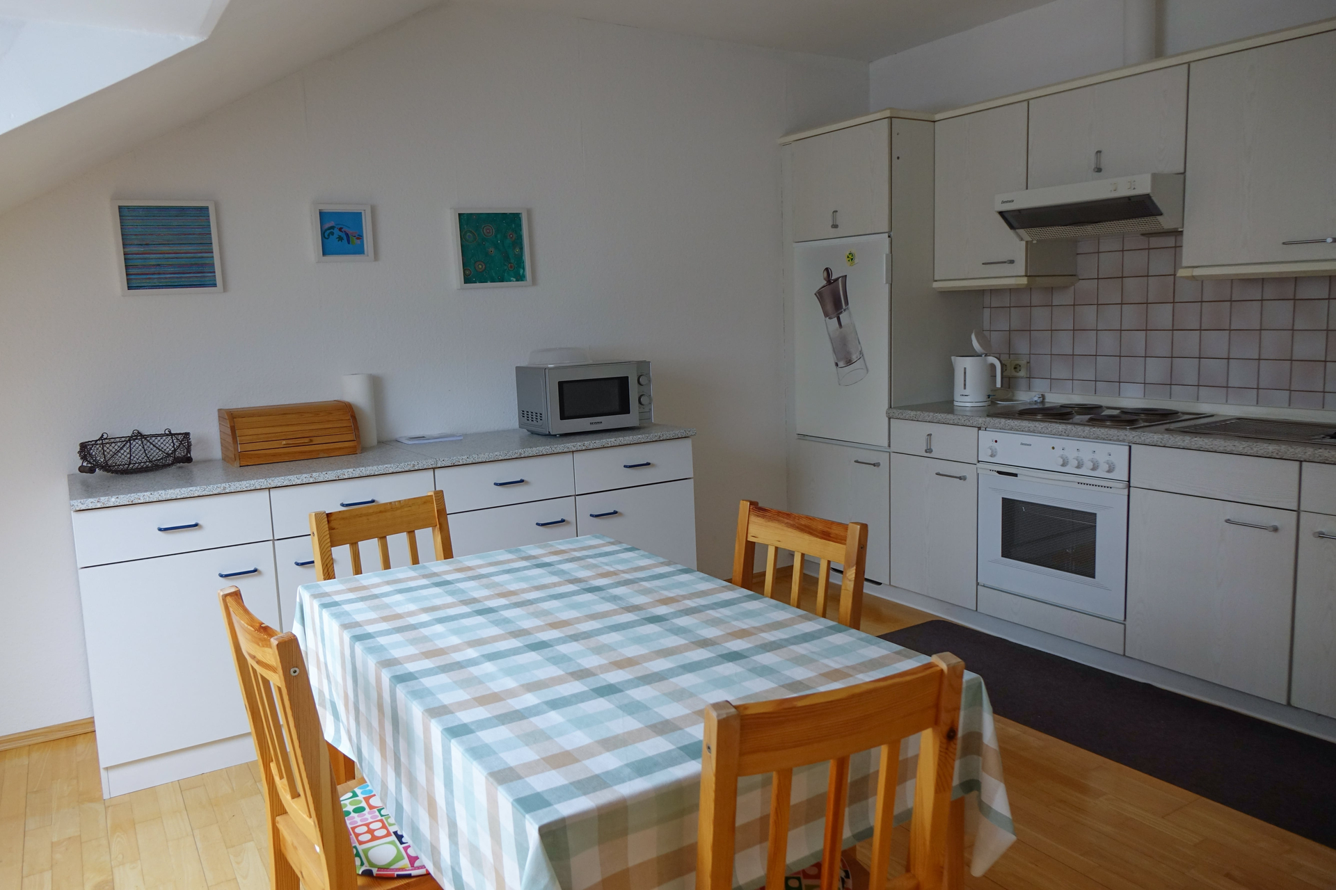 Die großzügige Ferienwohnung im 1. OG liegt im ruhigen Brackenheimer Teilort Haberschlacht und eignet sich bestens für Monteure. Die Küche verfügt über alles, was man benötigt, um gut in den Tag zu starten: Kaffeemaschine, Backofen, Mikrowelle, Teekocher usw.