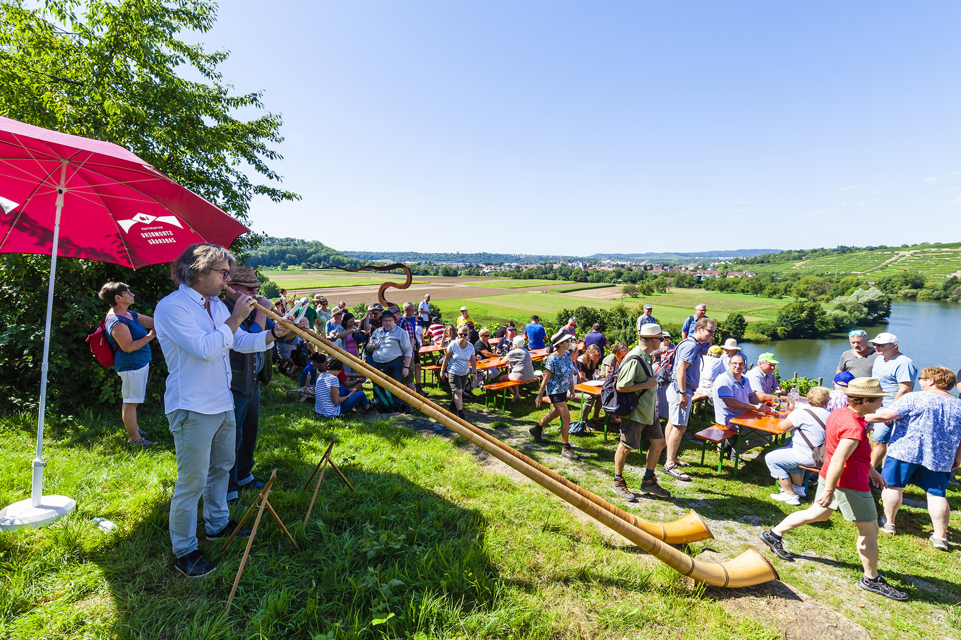 Freu dich auf einen herrlichen Blick über die Neckarschleife und die steilen Weinlagen am Kirchheimer Kirchberg.