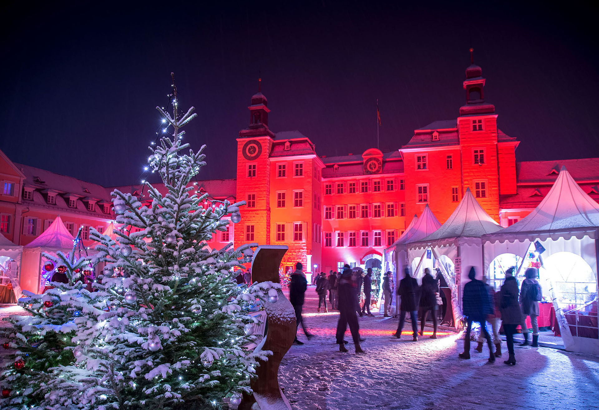 Das festlich beleuchtete Schloss stellt eine einmalige Kulisse für über vierzig weihnachtlich geschmückte Zelte dar, in denen Kunsthandwerker ihre liebevoll hergestellten weihnachtlichen Geschenkideen anbieten.