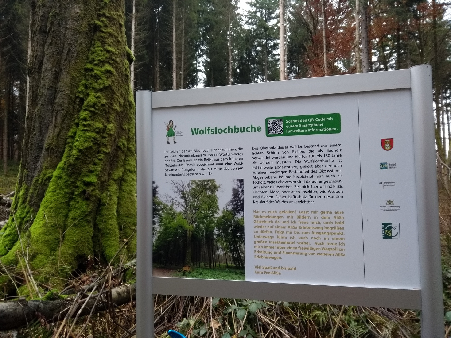 Folgt man dem Weg weiter bergab, gelangt man zur Wolfslochbuche. Im Frühjahr 2020 stand die Buche noch im vollen Saft, mittlerweile ist sie leider abgestorben.