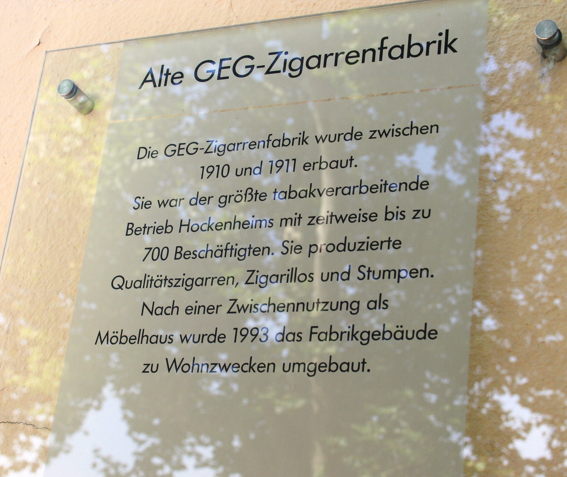 Die Tabakverarbeitung war in Hockenheim seit 1860 ein bedeutender Wirtschaftszweig und bot bis zur Schließung 1971 vielen Hockenheimern einen Arbeitsplatz. Das für die Großeinkaufsgenossenschaft Hamburg (GEG) erbaute Fabrikgebäude in Jugendstilform war der größte tabakverarbeitende Betrieb in Hockenheim, der bis in die 60iger Jahre die 8.500 Konsumläden der Bundesrepublik und Westberlins belieferte. 1993 wurde das Gebäude zu Wohnzwecken umgebaut, die äußere Form wurde jedoch beibehalten. Lediglich das Pförtnerhäuschen und die Remise sind einem Parkplatz gewichen. Etliche Erinnerungsstücke aus der Fabrik findet man heute im Tabakmuseum Hockenheim.