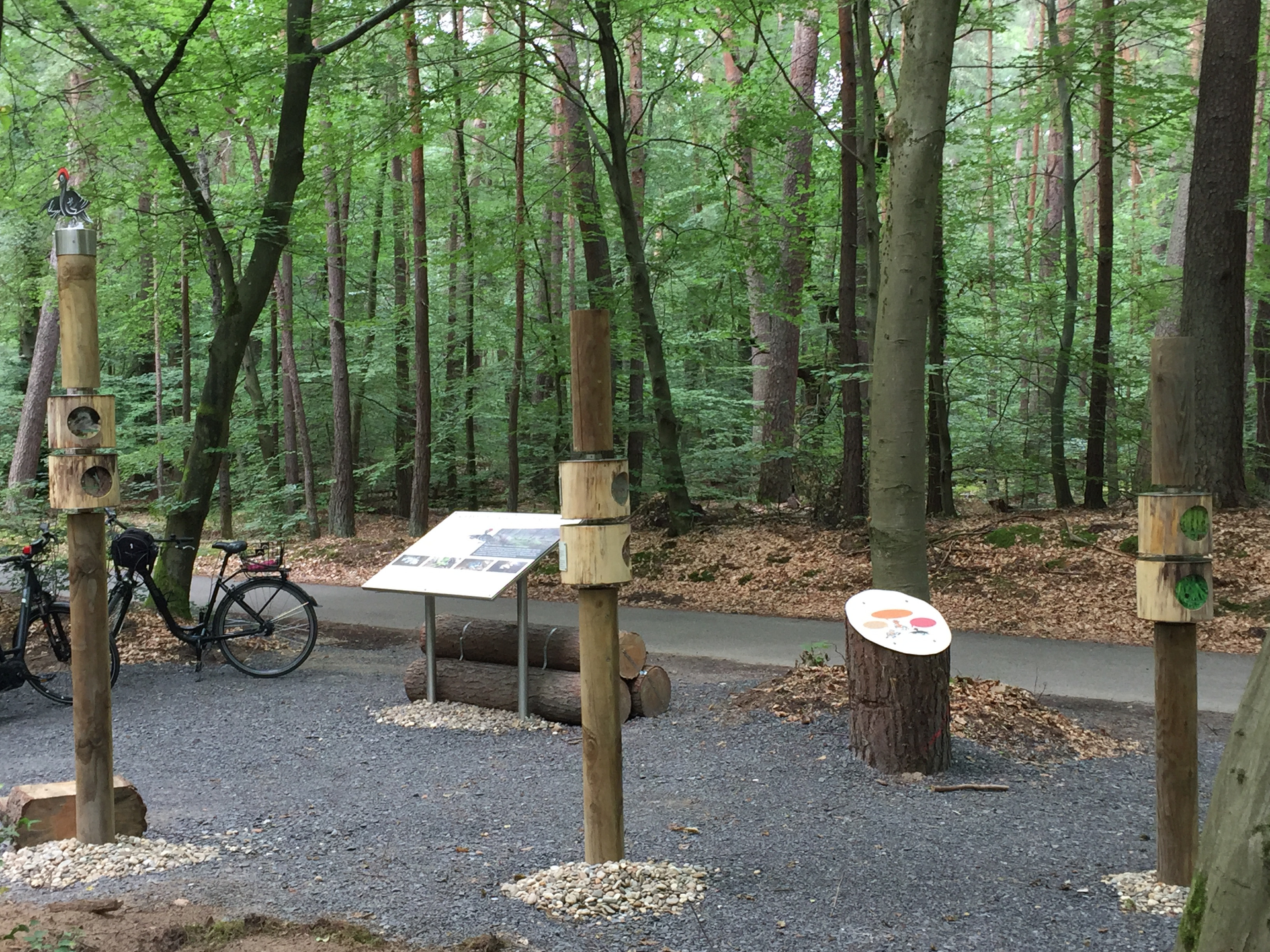 Auf einer Sitzbank aus Odenwälder Tannenholz kann eine Rast eingelegt werden und eigene Beobachtungen im Bannwald gemacht werden. Da die Bewohner des Bannwalds sich nicht immer zeigen und das Betreten des Bannwalds abseits fester Wege nicht gestattet ist, geben mehrere Lupenelemente einen detaillierten Blick zum Beispiel in die Kinderstuben von Hohltaube und Schwarzspecht.
