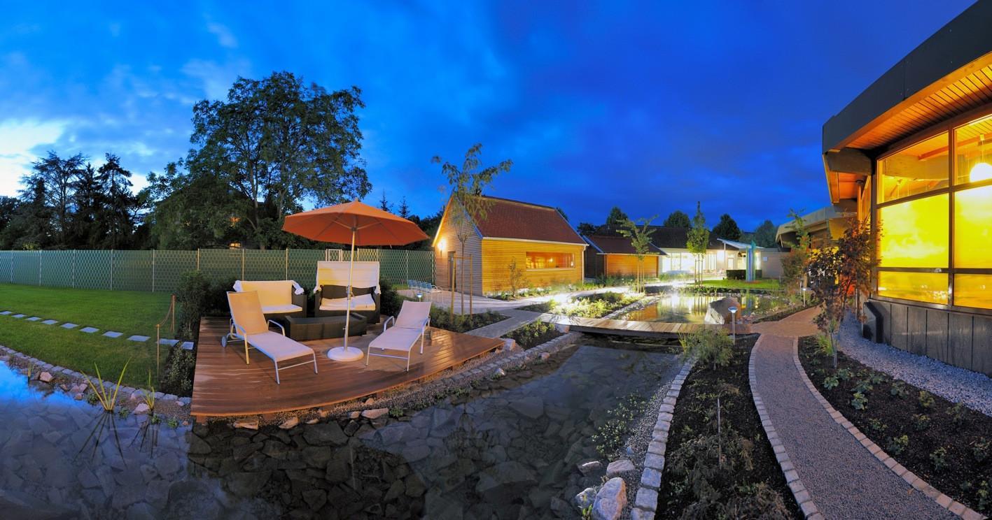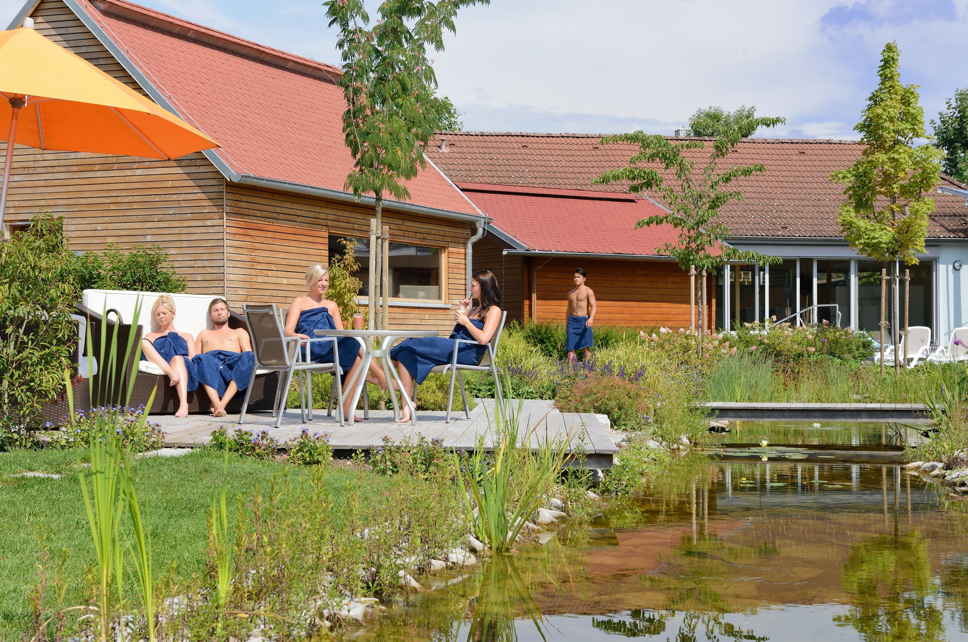 Ein weiteres Highlight: die neue Saunalandschaft, die alles für einen entspannenden Aufenthalt parat hat. Besondere „atmosphärische Ausblicke“ genießen die Saunagäste aus den großzügigen Fenstern der Panorama-Außensauna. Der beeindruckende Sauna-Garten, großzügig angelegt, mit einer Holzbrücke, umlaufenden gepflasterten Wegen, einer Liegewiese mit sattem Rollrasen, Bäumen, Sträuchern und Pflanzen bietet dafür beste Perspektiven.