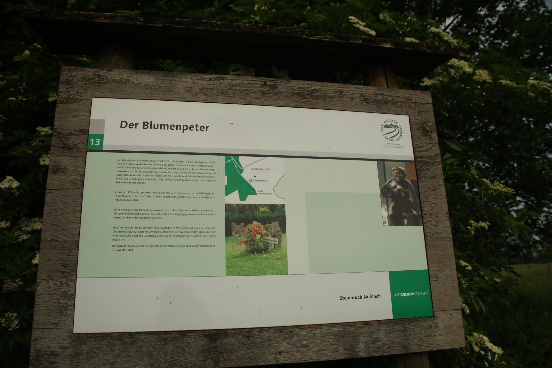 Eines der Gräber wird häufig mit Blumen geschmückt, das Grab vom "Blumepeter", wie das Original in der gesamten Region genannt wird. Zwar etwas "newwe der Kapp", wie die Kurpfälzer Menschen mit wunderlichen Anwandlungen charakterisieren, aber auch eine skurrile Persönlichkeit, über die zahllose Anekdoten und Witze kursieren. Für die Mannheimer ist der "Blumepeter" ein Sympathieträger erster Ordnung. Durch seinen Blumenverkauf in den Mannheimer Straßen und seine häufig wiederholten Sätze wie "Kaaf mer ebbes ab!" ("Kaufe mir etwas ab!") und "Schääne Blume, die Herrschafte!" ("Schöne Blumen, die Herrschaften") wurde er bekannt. Ein Denkmal steht auf den Kapuzinerplanken in Mannheim.