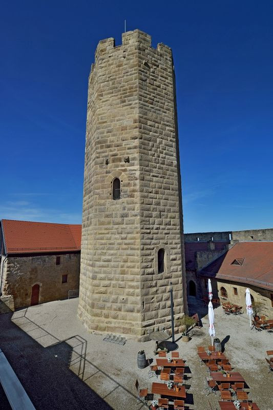 An klaren Tagen kann man die Vogesen, den Schwarzwald, den Pfälzer Wald und die Höhenrücken des Odenwalds sehen. Der innen und außen sanierte 30 m hohe Bergfried kann tagsüber während der Öffnungszeiten des Restaurants erklommen werden.