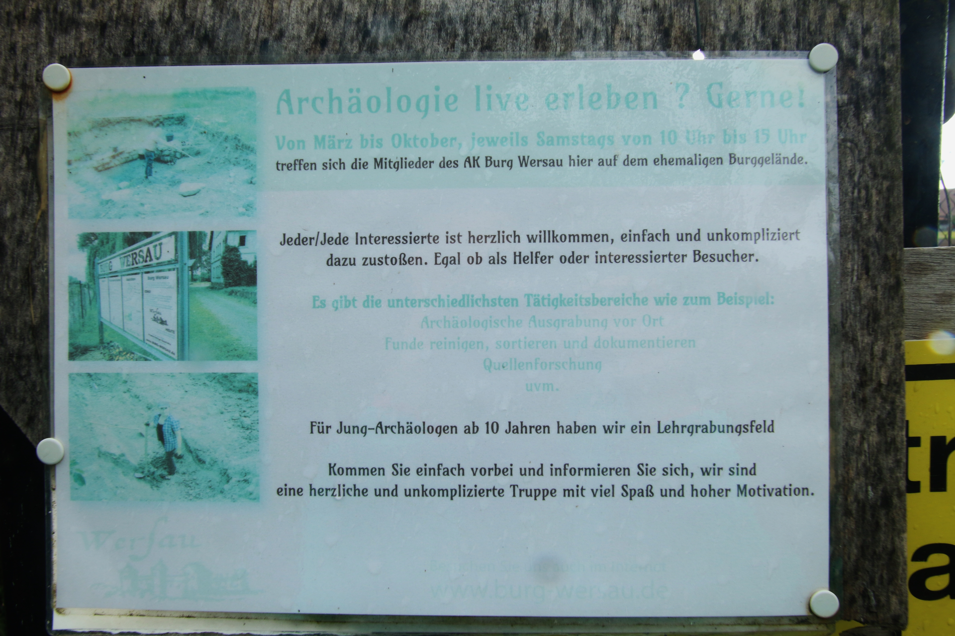 Von April bis Ende September ist jeden Samstag ab 10:00 Uhr bis mindestens 15:00 Uhr Grabungs-Treff des Arbeitskreis Burg Wersau auf der Schloßmühle in Reilingen.