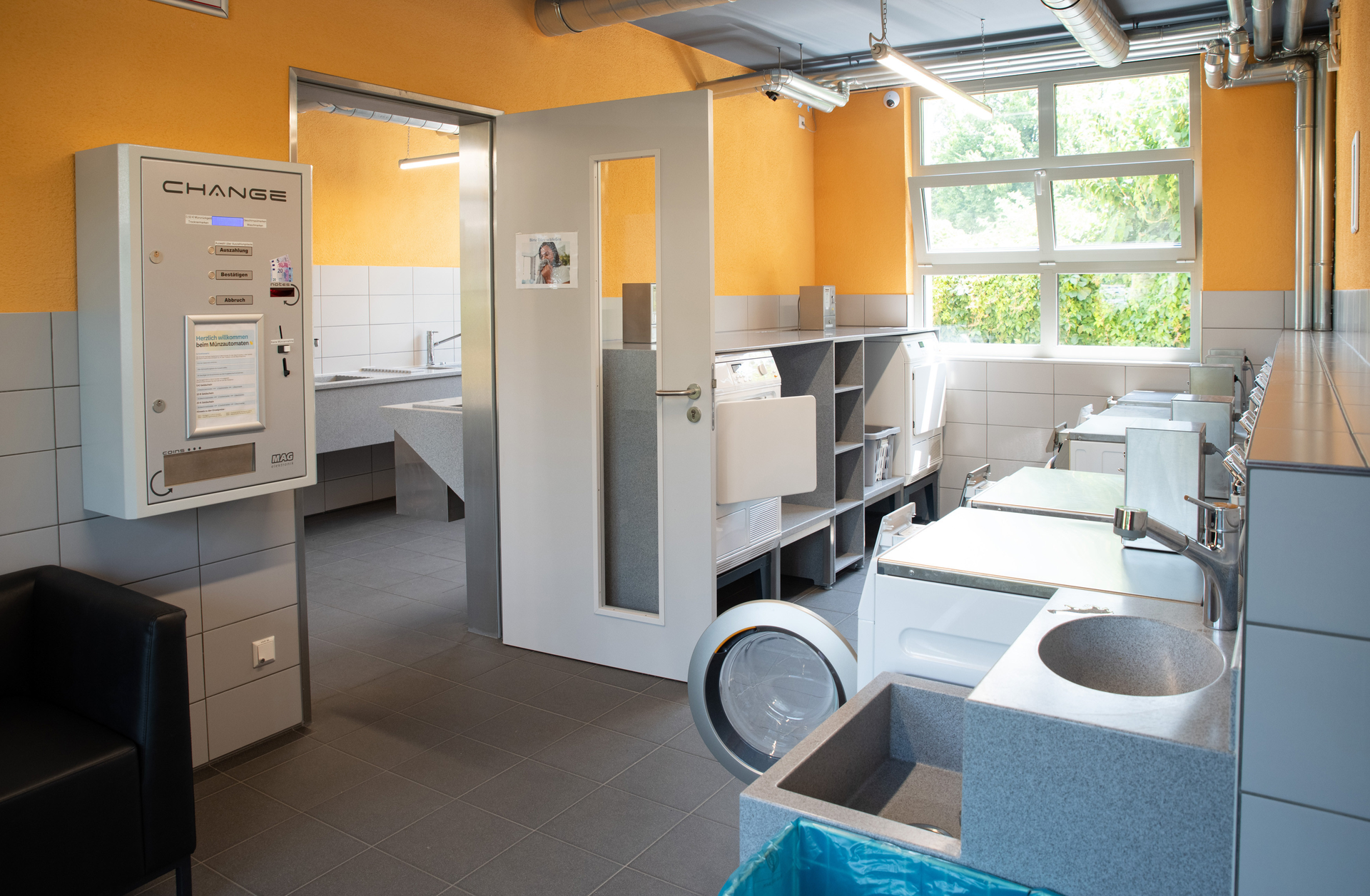 - Sanitäranlagen mit Einzelwaschkabinen, Babywickelräumen, Waschmaschinen und Trocknern