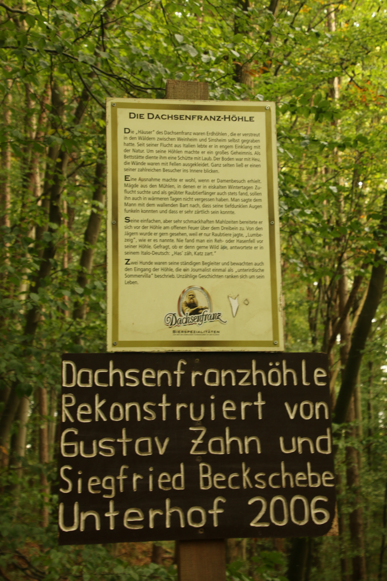 Die Dachsenfranzhöhle zwischen Dielheim und Horrenberg war einst die Wohnhöhle des 'Dachsenfranz' Francesco Regali, der vor über hundert Jahren in den Wäldern des Odenwaldes und im Kraichgau hauste. Nachdem er 1886 seinen Vorgesetzten im Militärdienst erstach, floh er nach Süddeutschland und lebte fortan als Eremit. In seine Wohnhöhle durften keine Gäste, der Eingang wurde von seinen zwei Hunden bewacht. Die Höhle wurde rekonstruiert und ist heute für Besucher frei zugänglich.
