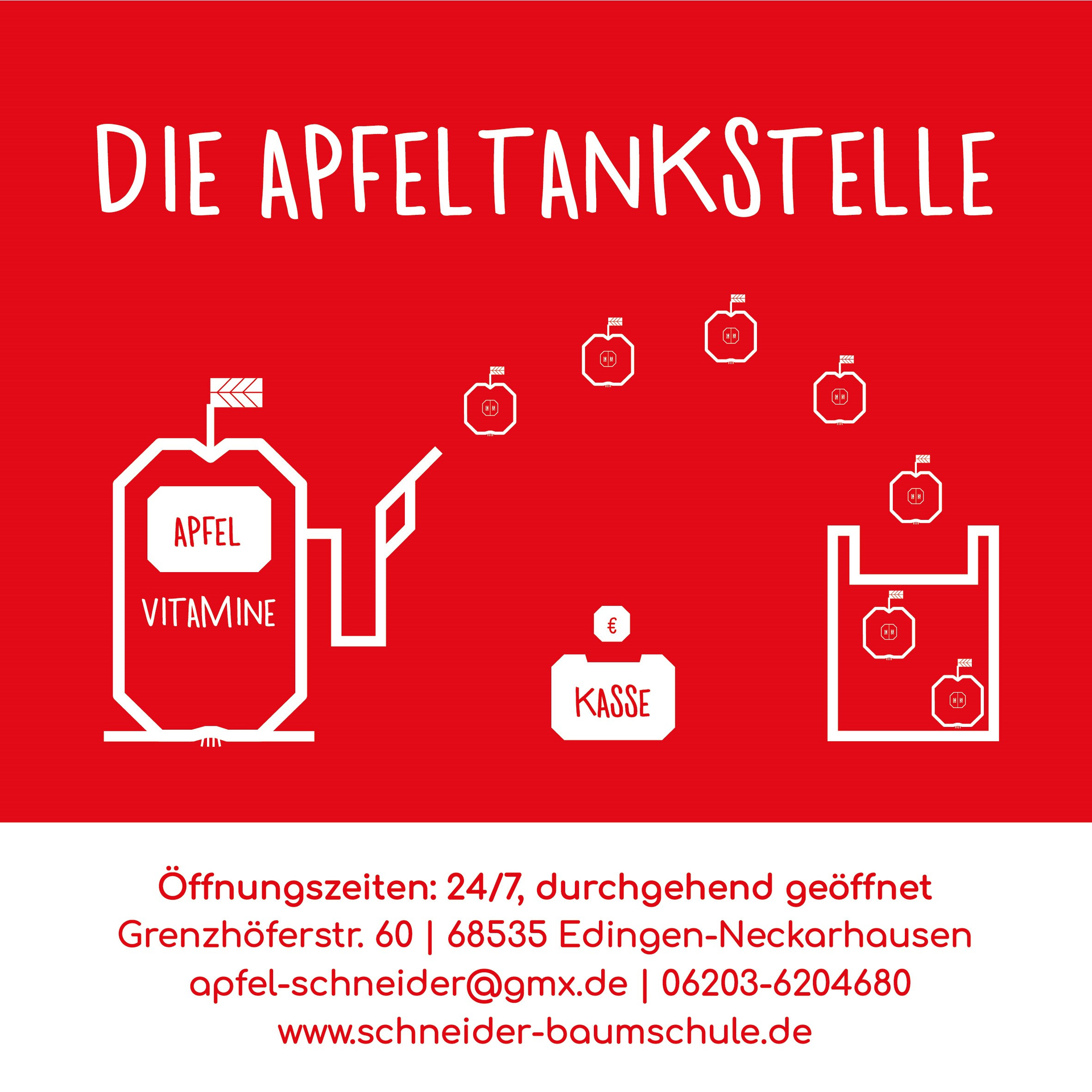 DIE APFELTANKSTELLE in der Grenzhöferstr. 60, 68535 Edingen, bietet Ihnen ein einzigartiges Konzept zum kontaktlosen Einkaufen im Hofladen mit Selbstbedienung, rund um die Uhr – 24/7. Dort finden Sie Produkte des APFEL SCHNEIDERS aus eigener Herstellung wie frisches Obst und Verarbeitetes zu Säften, Essig, Fruchtaufstrichen oder getrocknetem Obst. Außerdem umfasst das Sortiment zusätzliche Produkte aus der Region, wie Kartoffeln, Nudeln, Eiern, Honig, Obst und Gemüse. Das Konzept der APFELTANKSTELLE wurde 2021 mit dem TASPO Award in der Kategorie „Mit Kreativität durch die Krise“ ausgezeichnet.