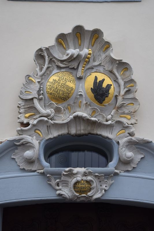 1766 entstand das schmucke dreigeschossige Gebäude mit Walmdach im Rokoko-Stil. Das reich verzierte Portal stammt von Bildhauer Paulus Erlacher. Ursprünglich war dort das katholische Pfarrhaus untergebracht, bis es 1838 das neue Pfarrhaus in der Pfarrgasse ablöste.