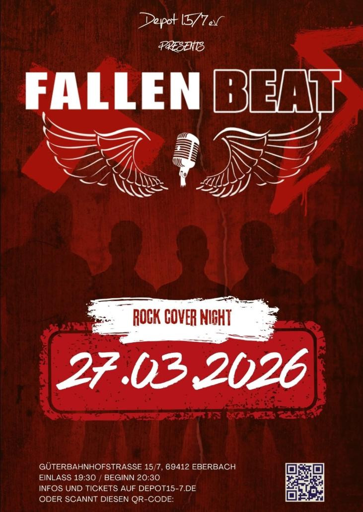 Am 27.03.2026 wird es laut im Depot 15/7 in Eberbach: Die Band Fallen Beat aus dem Raum Mosbach bringt den unverwechselbaren Sound der dänischen Rockband Volbeat auf die Bühne. Kraftvoll, energiegeladen und mit jeder Menge Spielfreude.