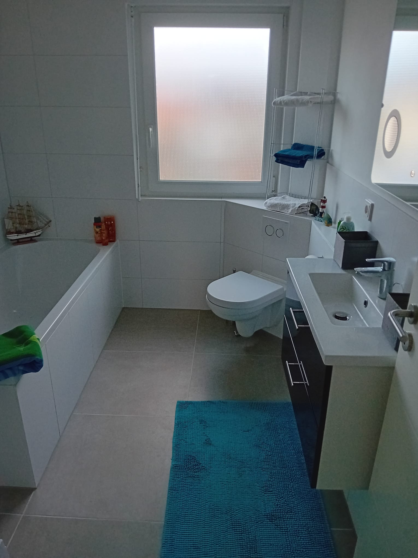 Das separate Tageslicht Bad hat ein WC, Waschbecken/Unterschrank und mit einem beleuchteten Spiegel sowie mit einem Kosmetikspiegel, eine große Glasdusche, einer geräumigen Badewanne und das Bad ist sehr hochwertig ausgestattet. Handtücher, Shampoo, Toilettenpapier, Haartrockner sind selbstverständlich vorhanden.