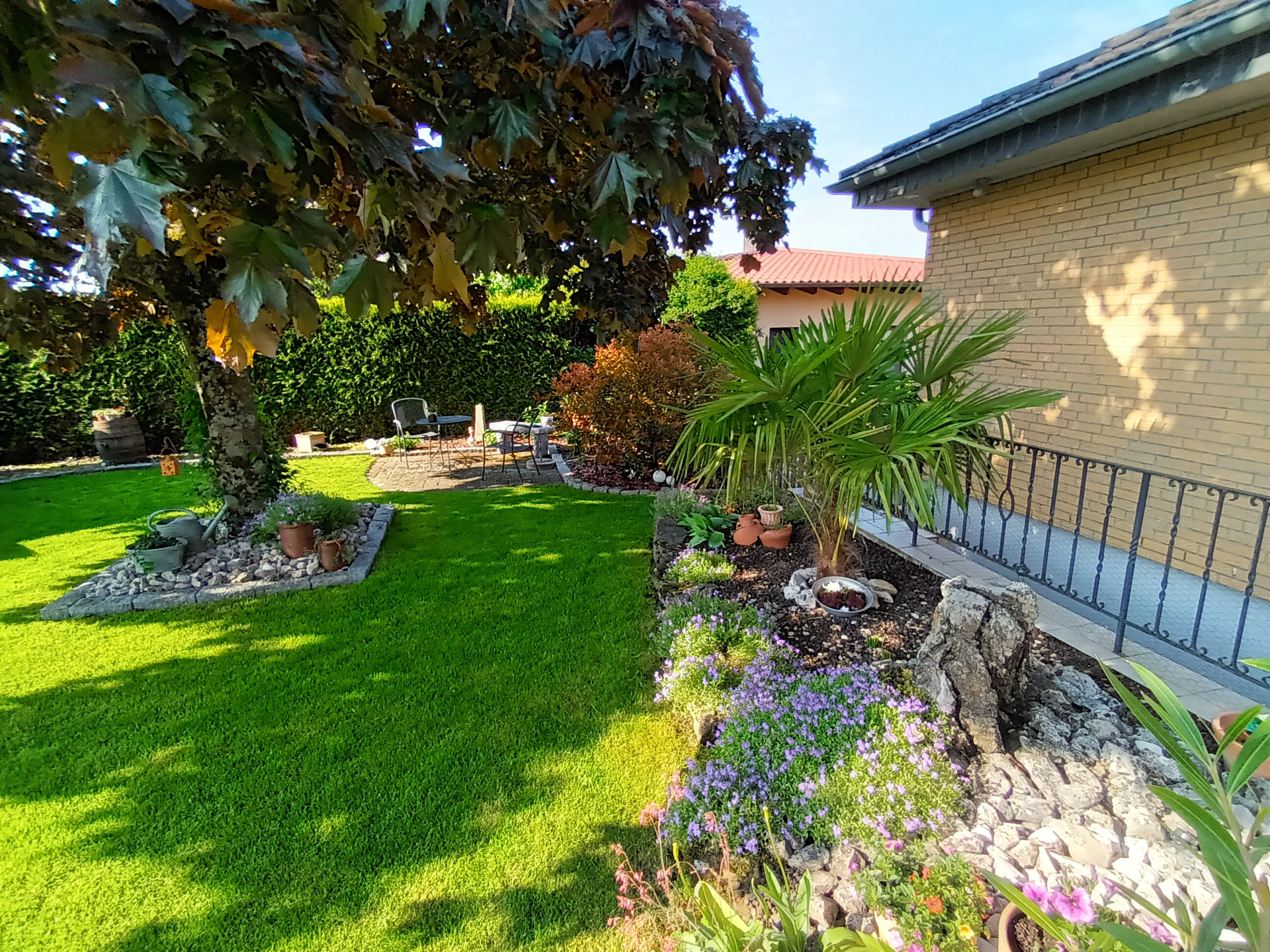 Gemütlicher Garten mit Sitzgelegenheiten und Gartenmöbeln mit Blick auf den Steinsberg.
