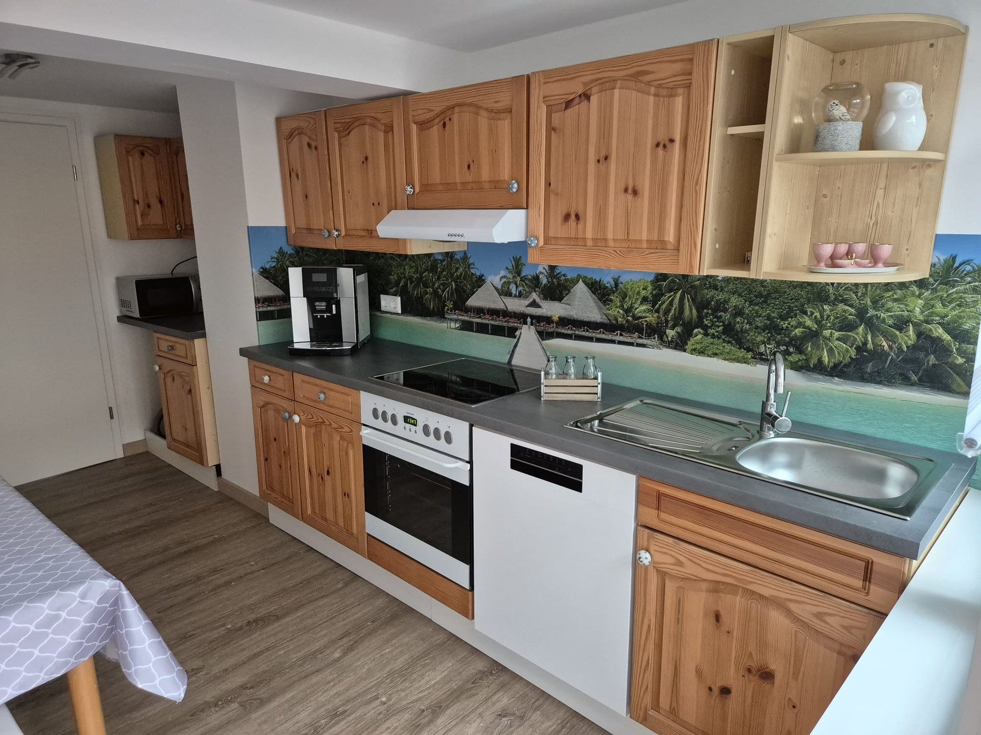 1 vollausgestattete Küche mit kleinem Essbereich (Geschirrspüler, Herd-Backofen, Kühlschrank, Kaffeevollautomat, Mikrowelle, Toaster, Wasserkocher)