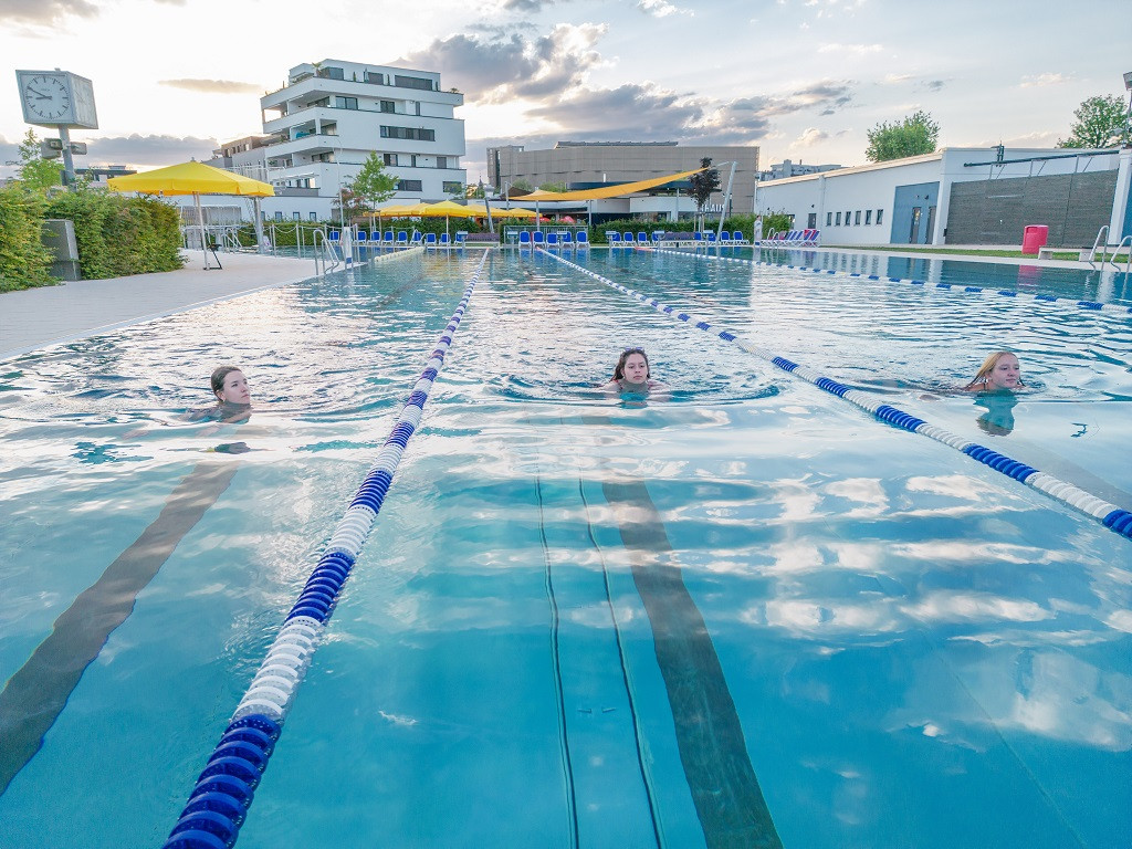 - Sonnenliegen rund um die Becken sowie Pfandliegen zur Nutzung auf der Liegewiese