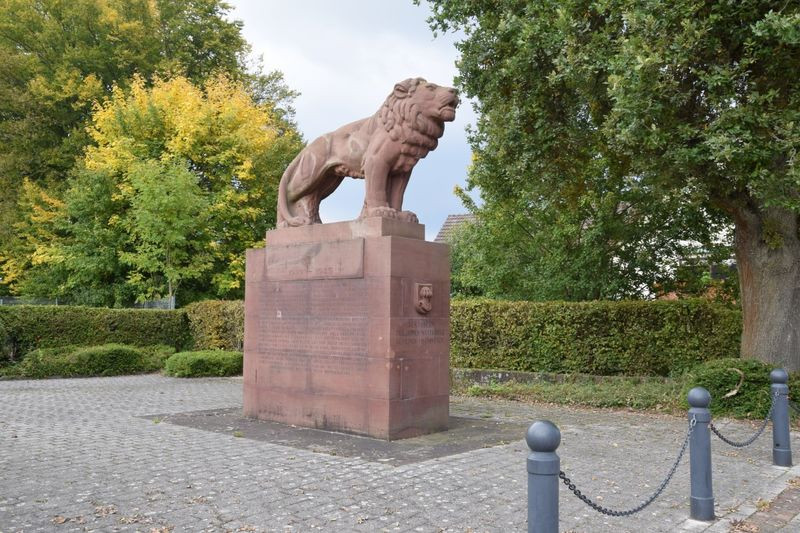 Ein steinerner Löwe auf einem Sockel dient als Gefallenendenkmal 1939-45.