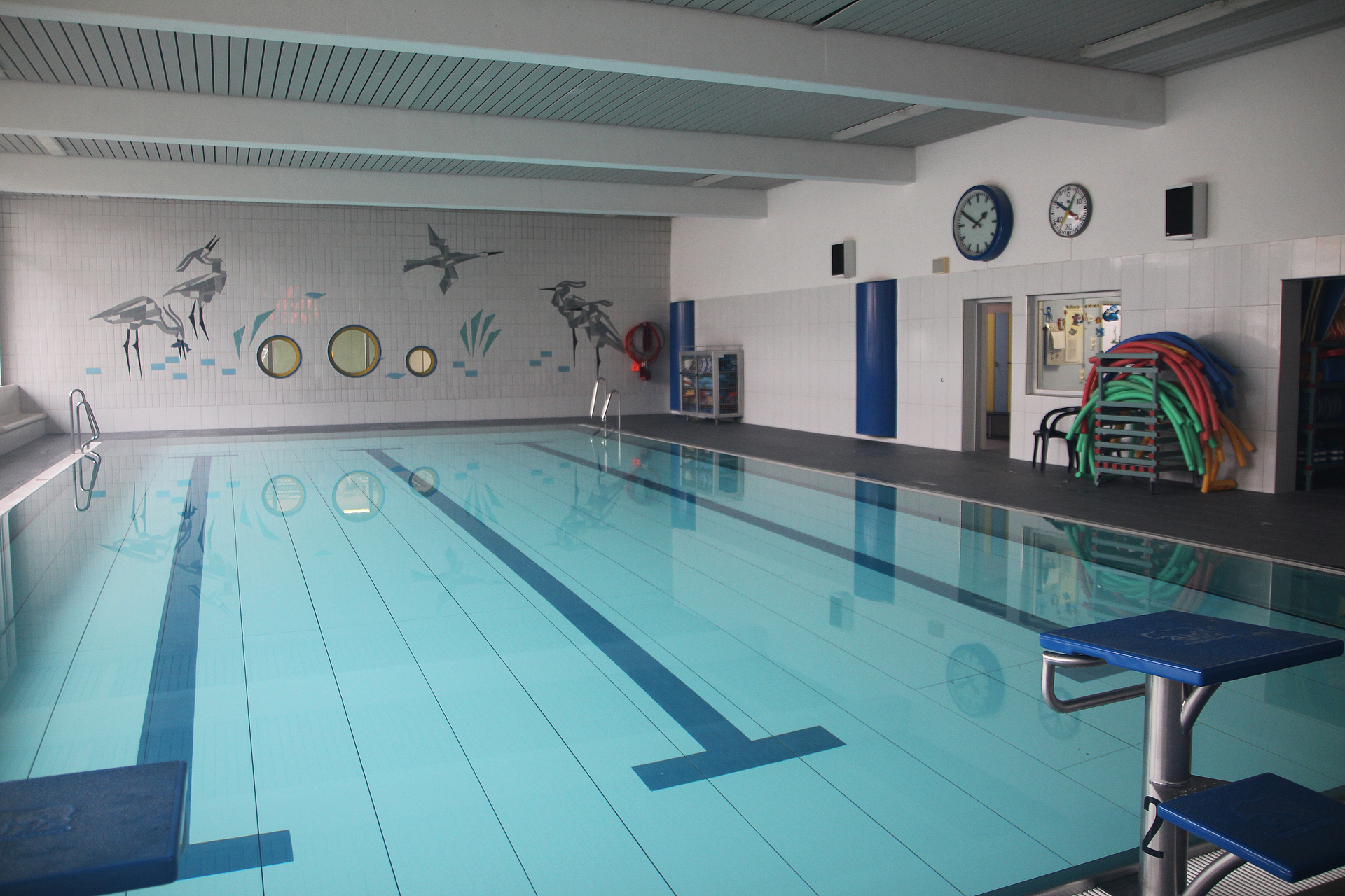 Das Hallenbad in Sandhausen bietet Schwimmern ein 16,33m langes Schwimmbecken mit Startblöcken und regulierbarer Wasserhöhe.