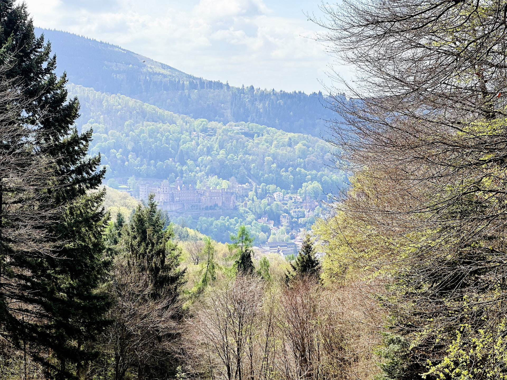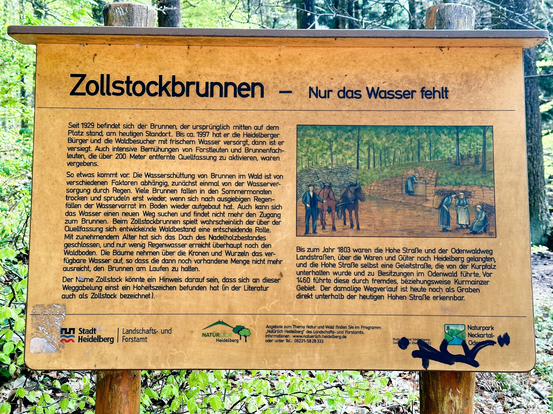Von hier aus fahren wir weiter nach Süden in Richtung Heidelberg, vorbei an Steinbrüchen, Schutzhütten und erreichen schließlich den Zollstockbrunnen. Hier bietet sich ein grandioser Ausblick auf das Heidelberger Schloss und die Alte Brücke und ein idealer Platz zum Verschnaufen und eine kleine Pause.