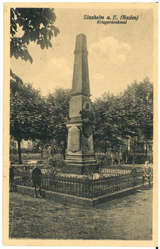 Es wurde 1891 eingeweiht und den Gefallenen des Deutsch-Französischen Krieges von 1870/71 gewidmet. Ein roter Sandsteinobelisk ragt aus einem Postament. Die ursprünglich auf der Rückseite des Denkmals angebrachte Tafel mit den Sinsheimer Kriegsteilnehmern wurde im Zweiten Weltkrieg eingeschmolzen.