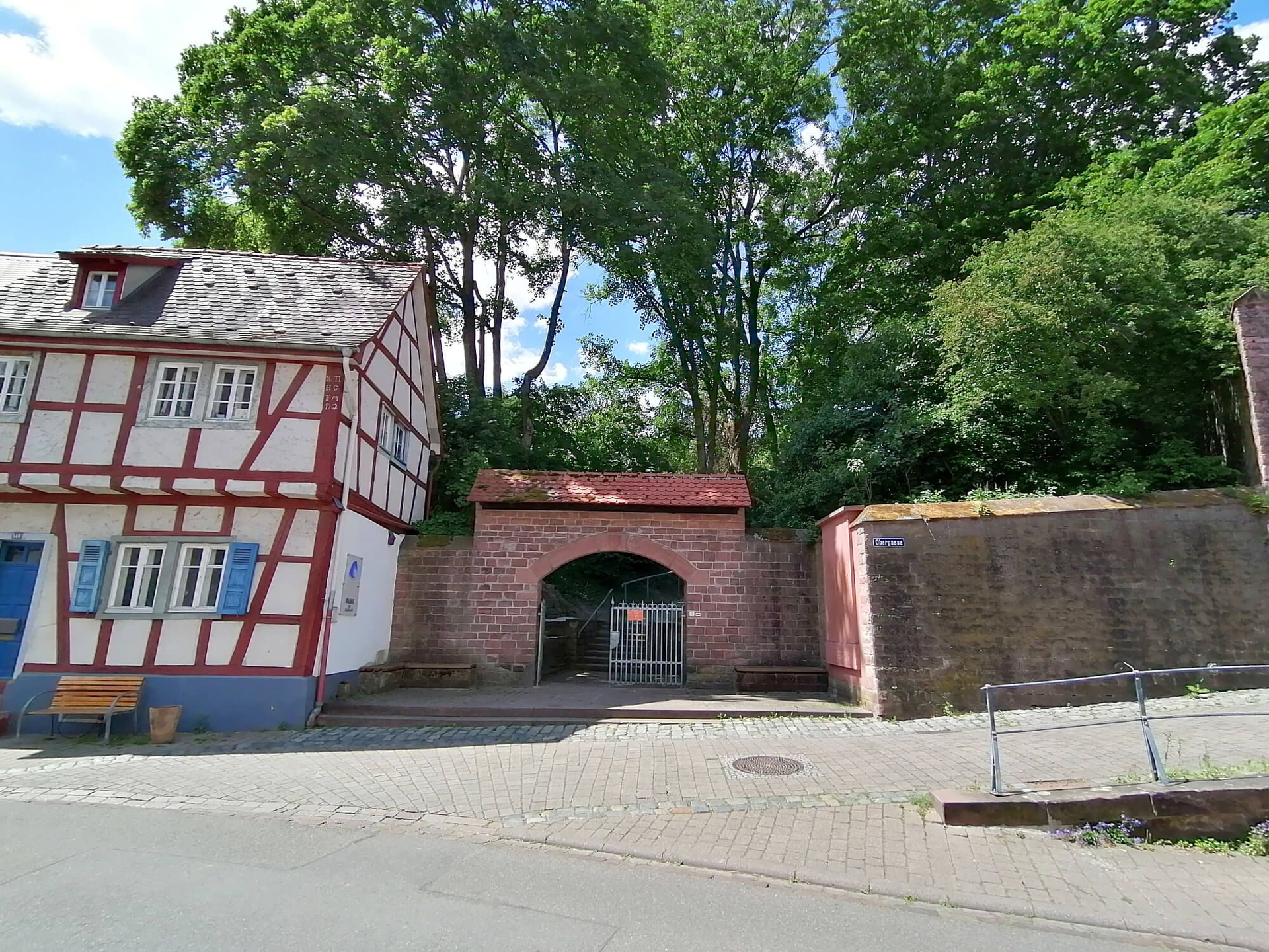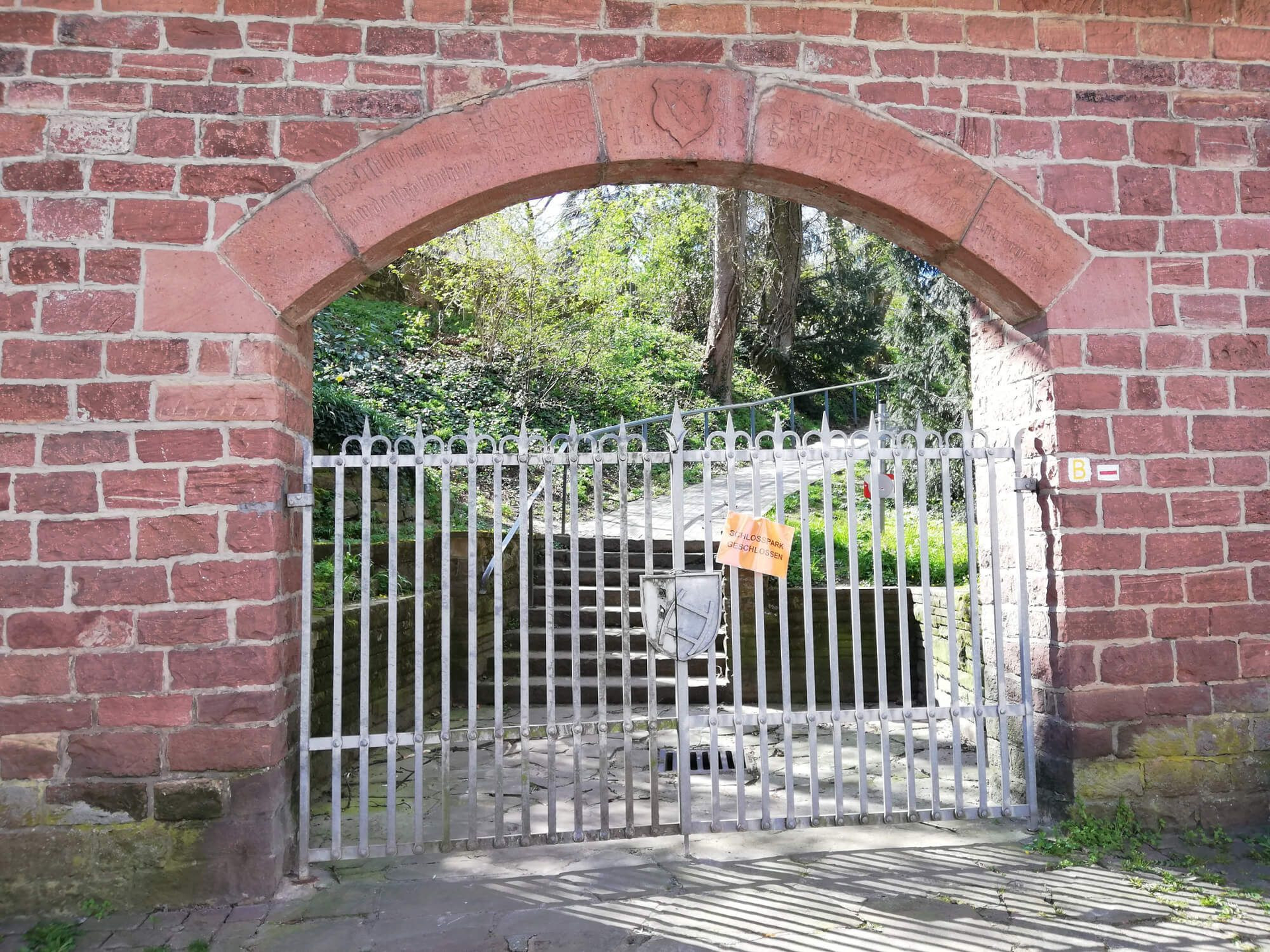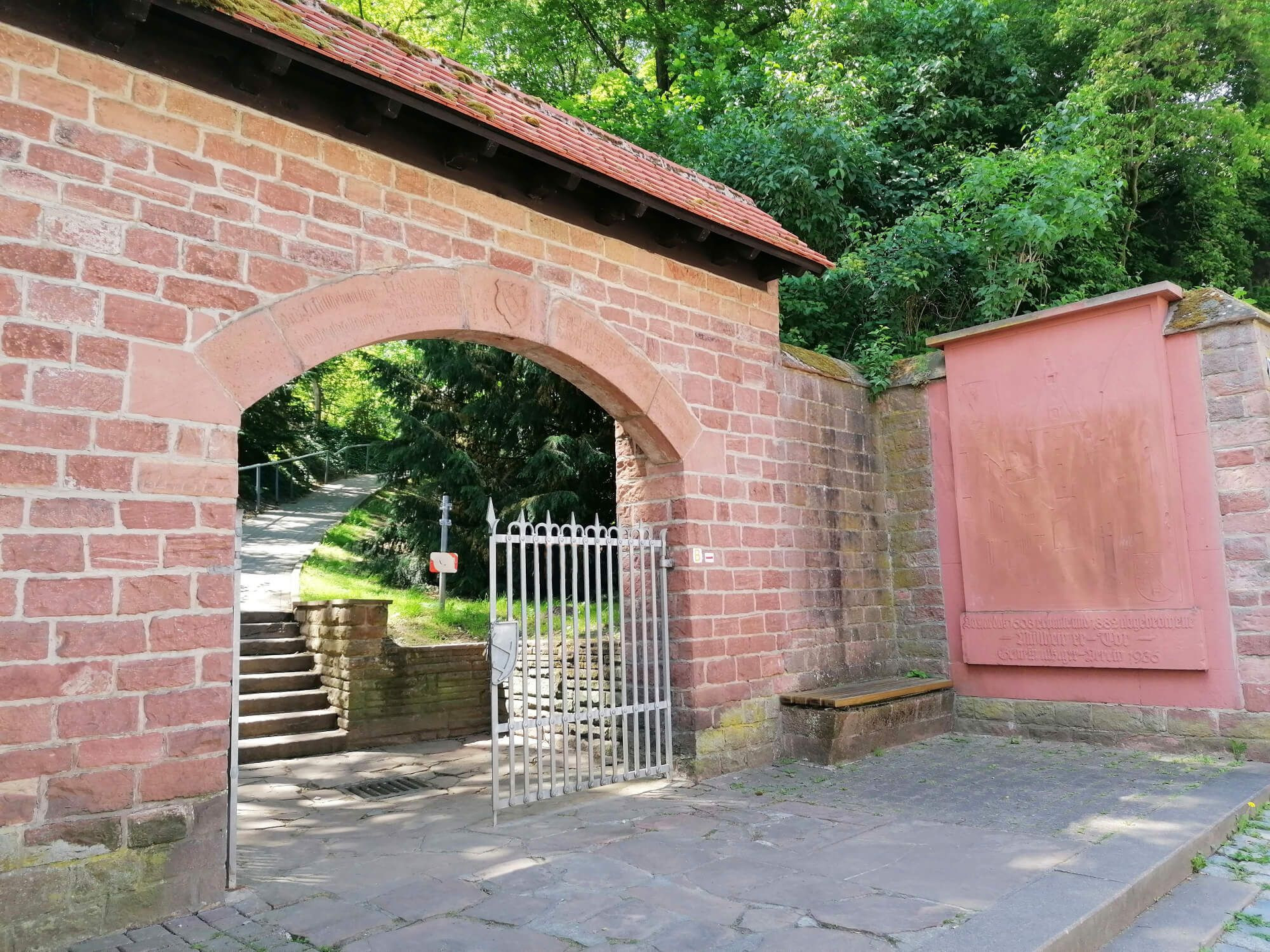 Wo einst eines der Stadttore Weinheims stand befindet sich eine Gedenktafel und einer der Eingänge zum Schlosspark.