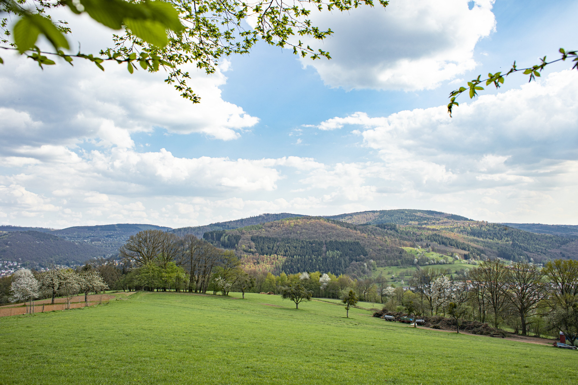 Durch eine Schneise im Wald kann man sehr schön auf Hirschhorn herabblicken. Der Steinerne Tisch wurde 1797 als Rastplatz für Jagdgesellschaften errichtet. Damals war der Blick auf das Schloss Hirschhorn noch frei.