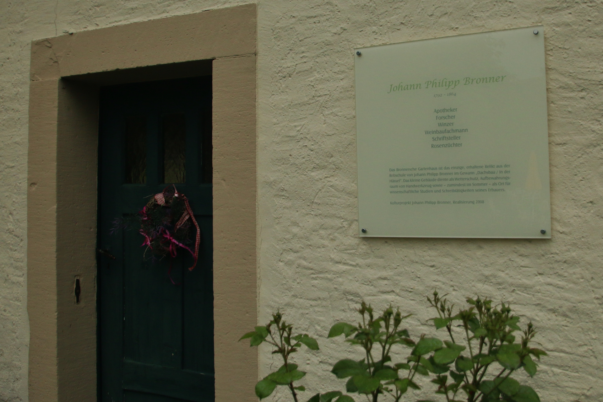 "Johann Philipp Bronner (1792 - 1864) war Apotheker in Wiesloch und wurde zu einem der führenden deutschen Weinbau-Experten in der ersten Hälfte des 19. Jahrhunderts. Seine umfassenden Studien, Versuche und seine Forschungsergebnisse waren Grundlage für die Nachhaltige Verbesserung des Weinbaus im Großherzogtum Baden.