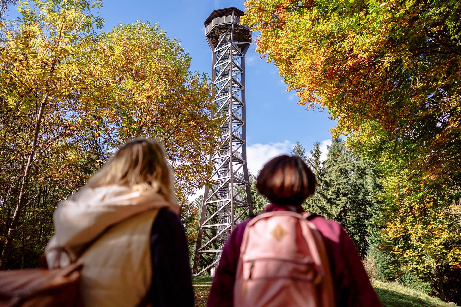 Hoch über Wilhelmsfeld ragt der moderne Teltschikturm aus dem Grün. Seine filigrane Stahlkonstruktion führt 35 Meter in den Himmel – oben öffnet sich ein Panorama, das seinesgleichen sucht: im Süden der Königstuhl, im Osten der Katzenbuckel, im Norden Krehberg und Melibokus, im Westen die Rheinebene mit den Pfälzer Bergen am Horizont. Hier oben fühlt sich die Landschaft grenzenlos an.