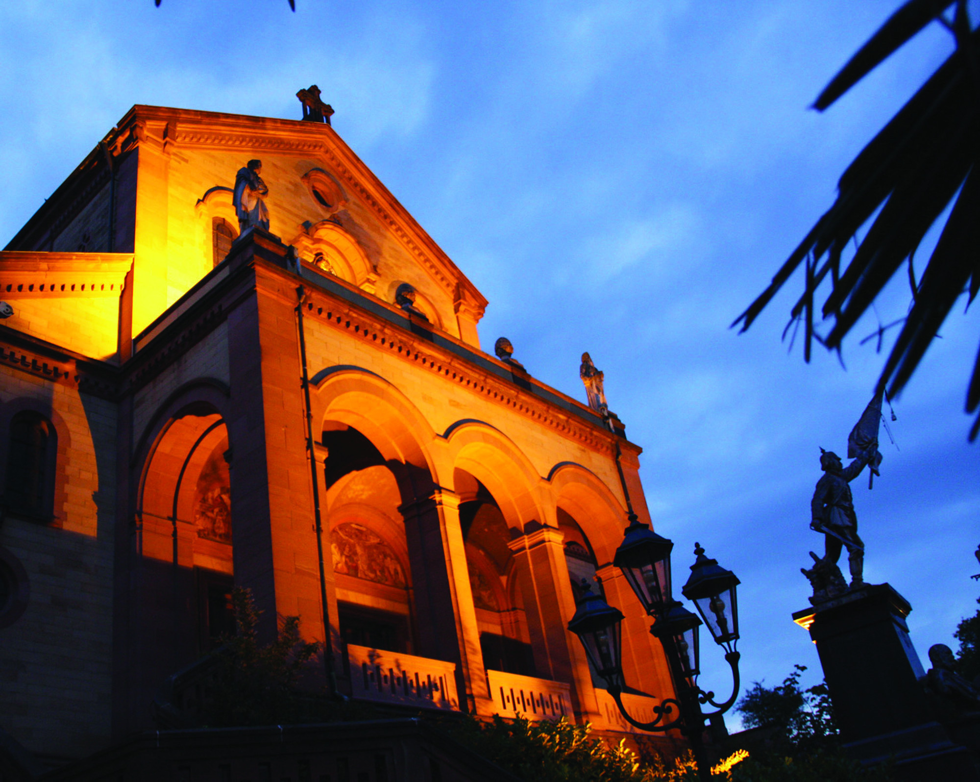 In der Weinheimer Innenstadt, am Kopf des Marktplatzbrunnen steht die katholische Kirche St. Laurentius.