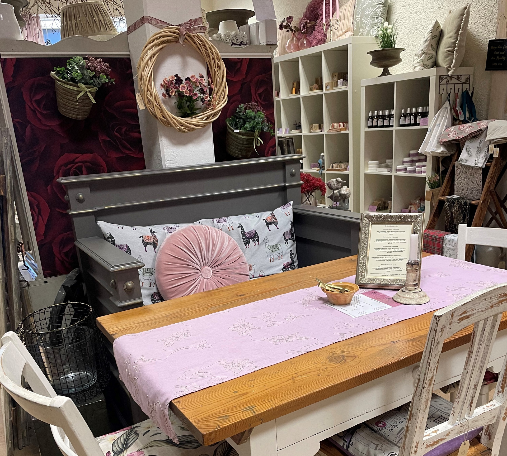Kaffeegenuss, der den Gaumen verwöhnt, schöne Dinge, die den Augen schmeicheln, Düfte, die die Nase verzaubern ... Das alles finden Sie bei uns. Genießen Sie Kaffee und Kuchen oder das gemütliche Frühstück in nostalgischer Atmosphäre. Neben edlen handgemachten Seifenstücken, wohltuender Badekosmetik, gestaltet wie kleine Kunstwerke, entdecken Sie auch Schönes und Stilvolles für Haus und Garten, antike Schätzchen oder besondere Dekorationen.