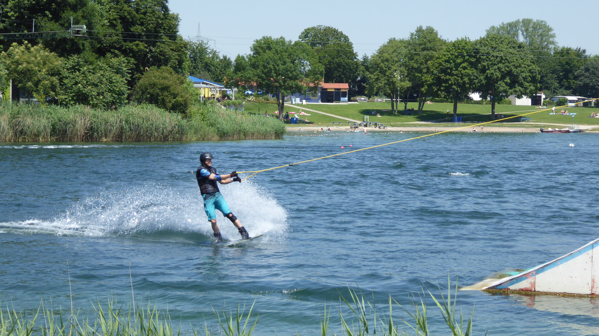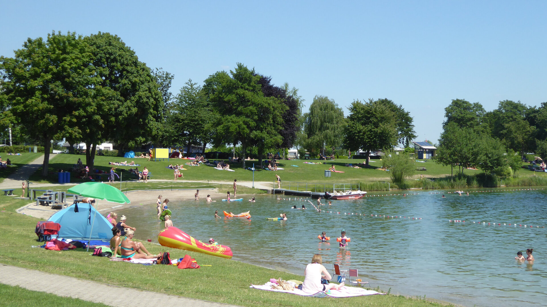 Der große Badesee mit Campingplatz, ausgedehnter Liegewiese, vielen Spielplätzen sowie einem Beachvolley- und Basketballfeld lädt zum Schwimmen, Entspannen und zu sportlichen Aktivitäten ein. Wasserski, Wakeboarden, Paddeln und Tauchen sind hier möglich. Der angeschlossene Wassersport- und Angelsee bietet die Möglichkeit zum Surfen, Segeln oder Angeln. Badezeit ist vom 15. April bis zum 15. September eines jeden Jahres.