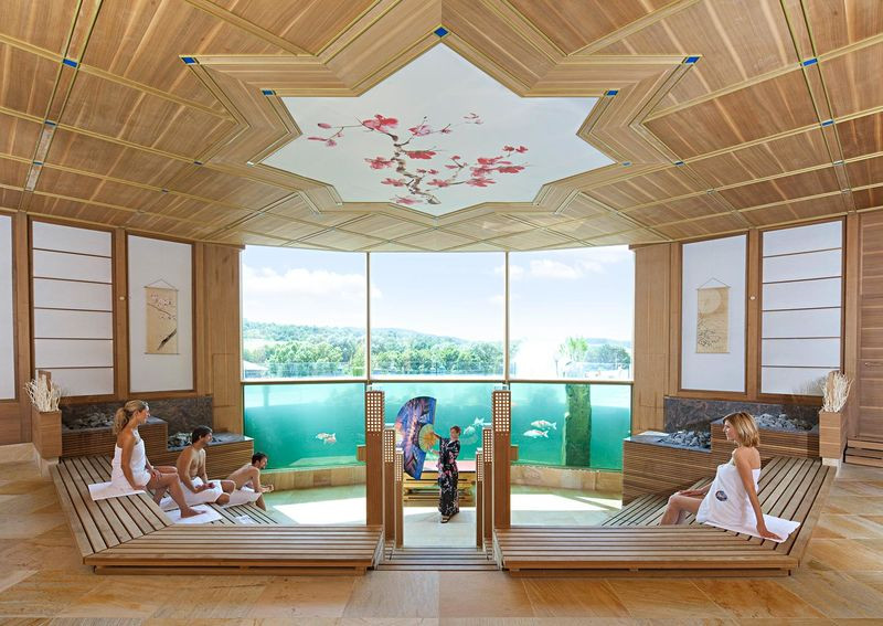 Acht exklusiv thematisierte Saunen versprechen in der Vitaltherme und Sauna ein unvergessliches Erlebnis. Für Erfrischung sorgen das Tauchbecken, die Calla-Blütendusche oder der Panorama-Pool mit Ausblick auf die hügelige Landschaft des Kraichgaus.