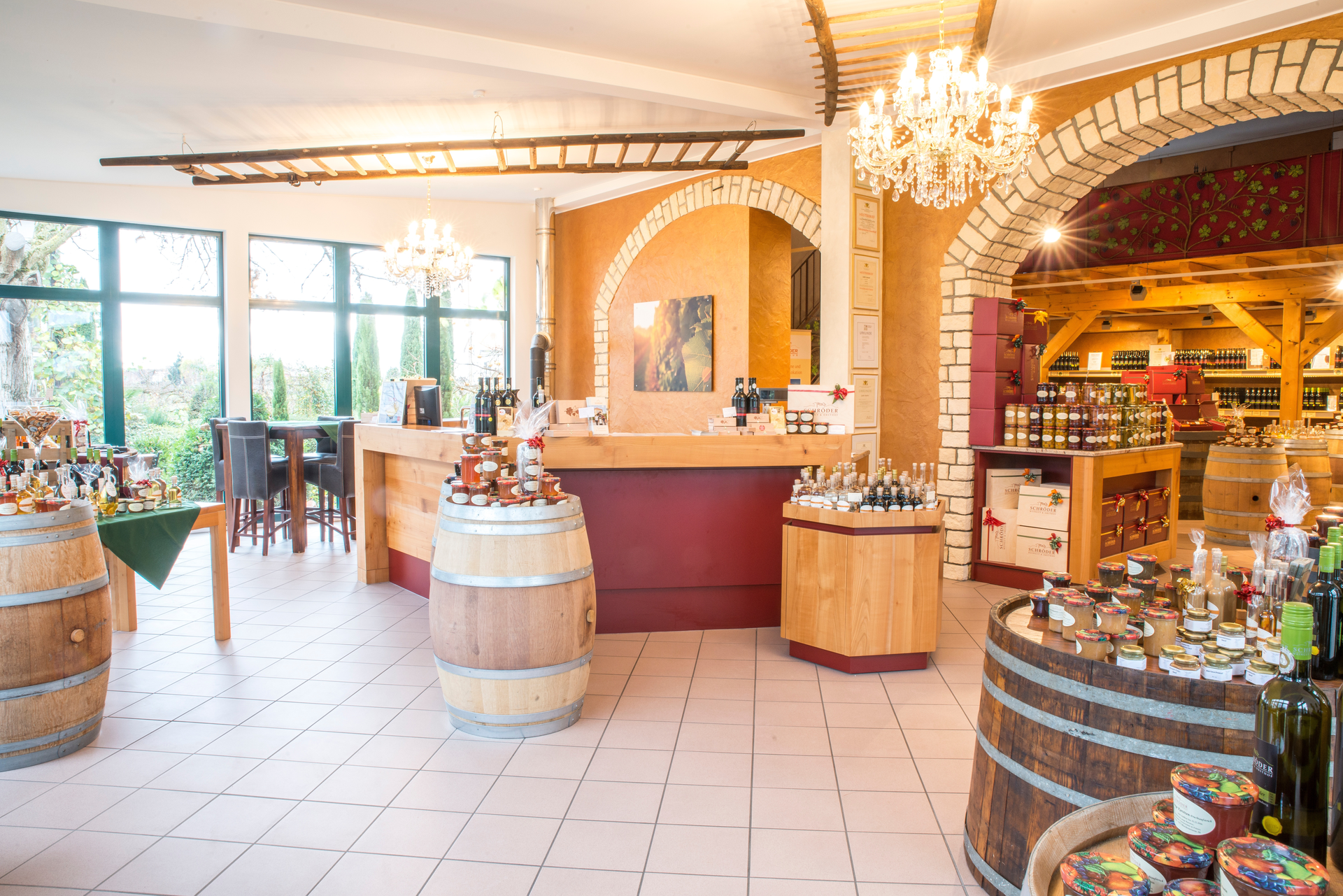 Weinverkauf in der stilvoll eingerichteten Vinothek, außerdem wird saisonales Obst angeboten.